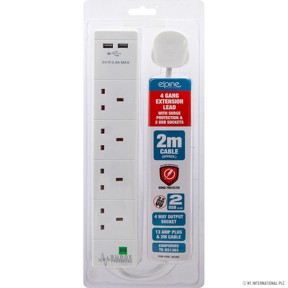 4 Gang 2M Extension Lead Surge 2 USB DB