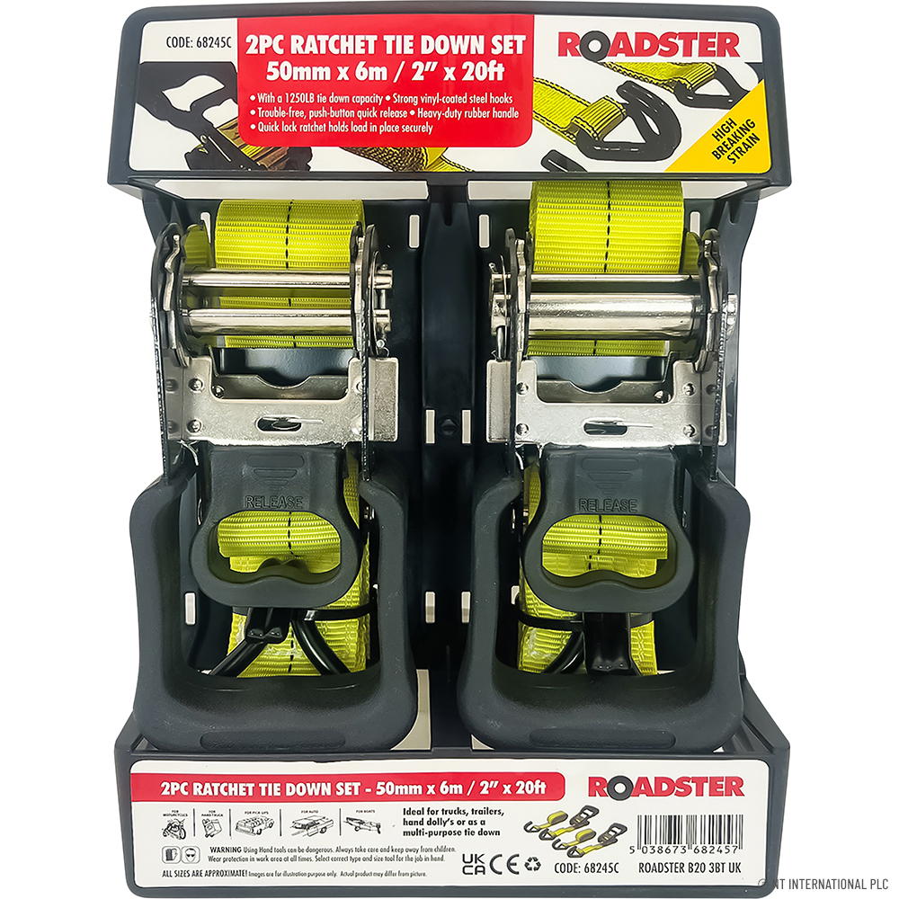 2pc 50mm x 6m (2500lb) Ratchet Tie Down
