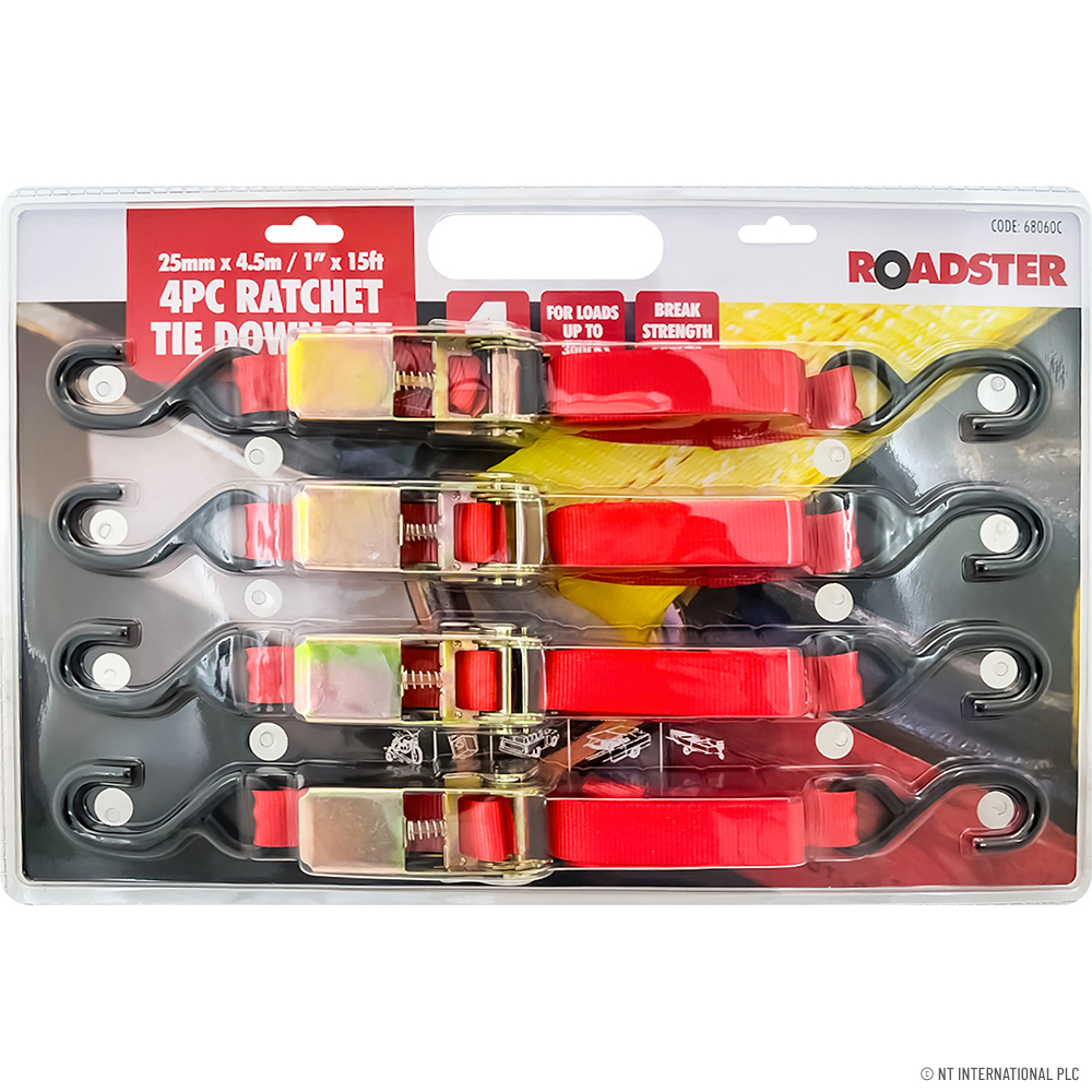 4pc 1"/25mm x 15ft/5m Ratchet Tie Down